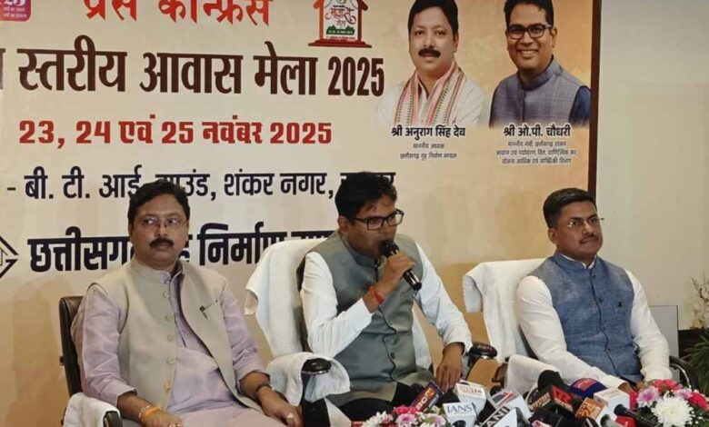 आवासीय योजनाओं की पूरी जानकारी एक ही स्थान पर उपलब्ध कराने के लिए छत्तीसगढ़ गृह निर्माण मंडल राज्य स्तरीय आवास मेला आयोजित कर रहा है। यह मेला 23, 24 और 25 नवंबर को राजधानी रायपुर के शंकर नगर स्थित बीटीआई ग्राउंड में होगा। मेले को लेकर आज वित्त मंत्री ओपी चौधरी और हाउसिंग बोर्ड अध्यक्ष अनुराग सिंहदेव ने संयुक्त प्रेस कॉन्फ्रेंस की। इस कॉन्फ्रेंस में हाउसिंग बोर्ड के कमिश्नर अवनीश शरण भी मौजूद रहे।