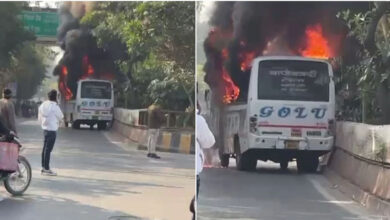 टक्कर के बाद आग की भयंकर लपटों में घिरी शुक्ला ब्रदर्स बस, इंदौर में यात्रियों ने बचाई जान