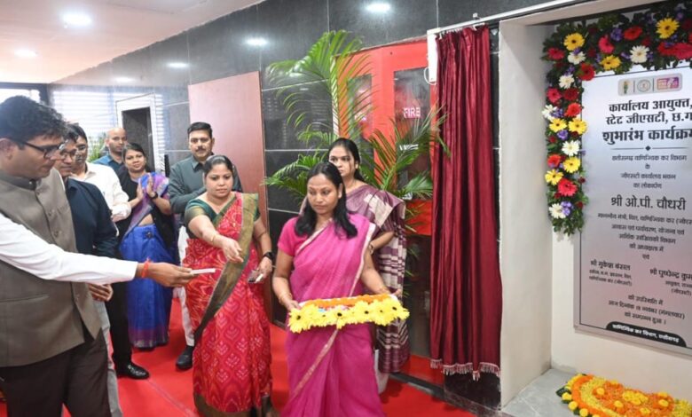 छत्तीसगढ़ के वित्त मंत्री ओ. पी. चौधरी ने नवा रायपुर स्थित सीबीडी बिल्डिंग के 5वें एवं 6वें तल पर निर्मित आयुक्त, राज्य कर (GST) के नए अत्याधुनिक कार्यालय भवन का विधिवत शुभारंभ किया। इस अवसर पर वित्त सचिव मुकेश बंसल, चेम्बर ऑफ कॉमर्स के चेयरमैन सतीश थौरानी एवं प्रतिनिधिगण, CAIT के राष्ट्रीय उपाध्यक्ष अमर परवानी, CA एसोसिएशन व बार एसोसिएशन के पदाधिकारी सहित रायपुर मुख्यालय एवं विभिन्न संभागों के अधिकारी-कर्मचारी उपस्थित रहे।