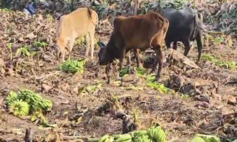 किसानों की मजबूरी: बाजार में कीमत धड़ाम, खेत में गाएं खा रही केले की फसल