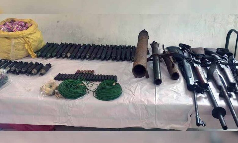 बीजीएल लांचर-2, 12 बोर- 2, एयरगन- 1, डायरेक्शन आईईडी-3, टिफिन आईईडी लगभग 5 किग्रा-1, बीजीएल बम-30, 12 बोर राउण्ड -26, बारुद प्लास्टिक पैकेट मे लगभग 2 किग्रा, मल्टी मीटर-1, पटाखा-12 पैकेट, बिजली वायर-2 बंडल, पोच-2, स्पिलंटर – 1 पैकेट